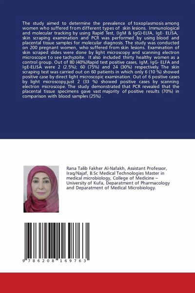The study aimed to determine the prevalence of toxoplasmosis among women who suffered from different types of skin lesions. Immunological and molecular tracking by using Rapid Test, (IgM & IgG)-ELFA, IgE- ELISA, skin scraping examination and PCR was performed by using blood and placental tissue samples for molecular diagnosis. The study was conducted on 200 pregnant women, who suffered from skin lesions. Examination of skin scraped slides were done by light microscopy and scanning electron microscope to see tachyzoite. It also included thirty healthy women as a control group. Out of 80 (40%)Rapid test positive cases, IgM, IgG- ELFA and IgE-ELISA were 2 (2.5%); 60 (75%) and 24 (30%) respectively. The skin scraping test was carried out on 60 patients in which only 6 (10 %) showed positive case by direct light microscopic examination. Out of 6 positive cases by light microscopy,just 2 (33 %) showed positive cases by scanning electron microscope. The study demonstrated that PCR revealed that the placental tissue specimens gave vast majority of positive results (70%) in comparison with blood samples (25%) .