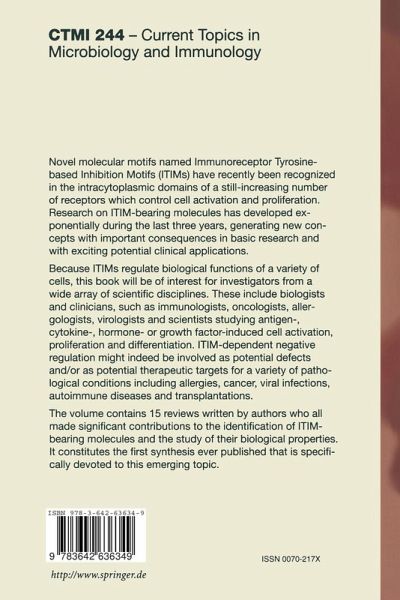 Novel molecular motifs named Immunoreceptor Tyrosine-based Inhibition Motifs (ITIMs) have recently been recognized in the intracytoplasmic domains of a still-increasing number of receptors which control cell activation and proliferation. Research on ITIM-bearing molecules has developed exponentially during the last three years, generating new concepts with important consequences in basic research and with exciting potential clinical applications. The present volume contains 15 reviews written by authors who all made significant contributions to the identification of ITIM-bearing molecules and the study of their biological properties. It constitutes the first synthesis ever published that is specifically devoted to this emerging topic.