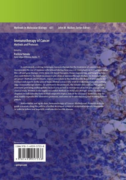 "17 chapters devoted to techniques and their application to the treatment of cancer as well as two general overviews. ... Both trainees and experts in basic and clinical science who wish to undertake studies involving immunotherapy are the intended audience. It would be useful for those who are not familiar with what immunotherapeutic procedures actually involve. ... The book is well put together and offers a lot of information that would be helpful to someone about to embark on developing immunotherapeutic treatments for cancer." (Marion C. Cohen, Doody's Review Service, March, 2011)