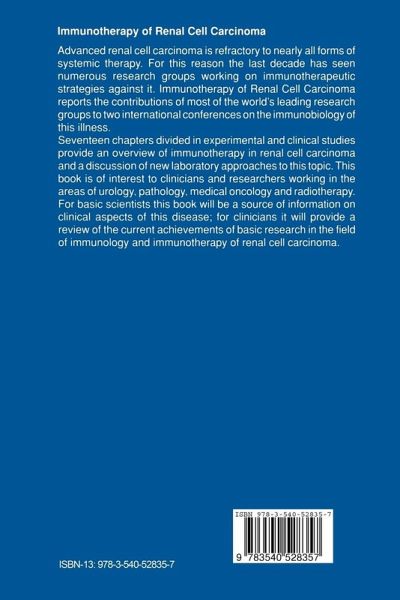 Advanced renal cell carcinoma is refractory to nearly forms of systemic therapy. For this reason the last decade has seen numerous research groups working on immunotherapeutic strategies against it. Immunotherapy of Renal Cell Carcinoma reports the contributions of most of the world's leading research groups to two international conferences on the immunobiology of this illness. Sixteen chapters divided in experimental and clinical studies provide an overview of immunotherapy in renal cell carcinoma and a discussion of new laboratory approaches to this topic.