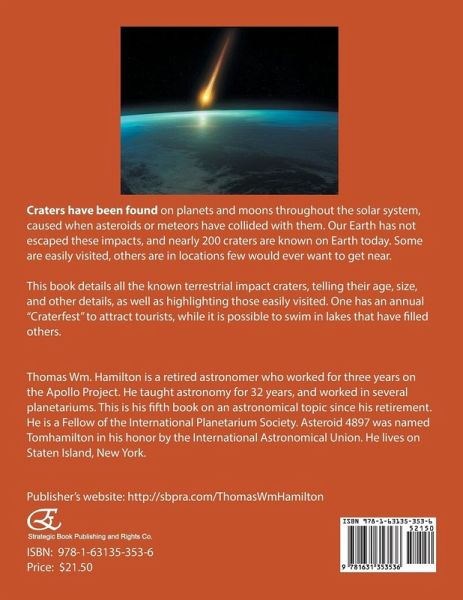 Craters have been found on planets and moons throughout the solar system, caused when asteroids or meteors have collided with them. Our Earth has not escaped these impacts, and nearly 200 craters are known on Earth today. Some are easily visited, others are in locations few would ever want to get near.This book details all the known terrestrial impact craters, telling their age, size, and other details, as well as highlighting those easily visited. One has an annual "Craterfest" to attract tourists, while it is possible to swim in lakes that have filled others.Thomas Wm. Hamilton is a retired astronomer who worked for three years on the Apollo Project. He taught astronomy for 32 years, and worked in several planetariums. This is his fifth book on an astronomical topic since his retirement. He is a Fellow of the International Planetarium Society. Asteroid 4897 was named Tomhamilton in his honor by the International Astronomical Union. He lives on Staten Island, New York.