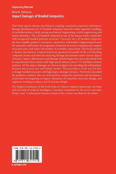 Chapter 1: Literature review.- Chapter 2: Thermo-mechanical coupling constitutive equations of braided composites.- Chapter 3: Multi-scale geometrical model of 3-D braided composites.- Chapter 4: Transverse impact of braided beams.- Chapter 5: Transverse impact of braided tubes.- Chapter 6: Axial impact damages of braided tubes at room temperature.- Chapter 7: Axial impact damages of braided tubes at low temperature.- Chapter 8: Multiscale structure mechanisms on transverse impact damages in beams.- Chapter 9: Multiscale structure mechanisms on axial compressive impact damages.- Chapter 10: Impact strength with thermo-mechanical coupling effect.- Chapter 11: Summary.