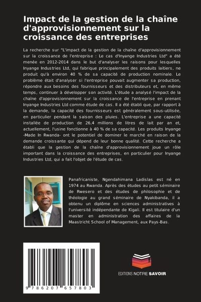 La recherche sur "L'impact de la gestion de la chaîne d'approvisionnement sur la croissance de l'entreprise : Le cas d'Inyange Industries Ltd" a été menée en 2012-2014 dans le but d'analyser les raisons pour lesquelles Inyange Industries Ltd, qui fabrique principalement des produits laitiers, ne produit qu'à environ 40 % de sa capacité de production nominale. Le problème était d'analyser si l'entreprise pouvait augmenter sa production, répondre aux besoins des fournisseurs et des distributeurs et, en même temps, continuer à développer son activité. L'étude a analysé l'impact de la chaîne d'approvisionnement sur la croissance de l'entreprise en prenant Inyange Industries Ltd comme étude de cas. Il a été établi que, par rapport à la demande, la capacité des fournisseurs est généralement sous-utilisée, en particulier pendant la saison des pluies. L'entreprise a une capacité installée de production de 26,4 millions de litres de lait par an et, actuellement, l'usine fonctionne à 40 % de sa capacité. Les produits Inyange -Made In Rwanda- ont le potentiel de dominer le marché en raison de la demande croissante qui dépend de leur bonne qualité. Cette recherche a établi que la gestion de la chaîne d'approvisionnement joue un rôle important dans la croissance des entreprises, en particulier pour Inyange Industries Ltd, qui a fait l'objet de l'étude de cas.