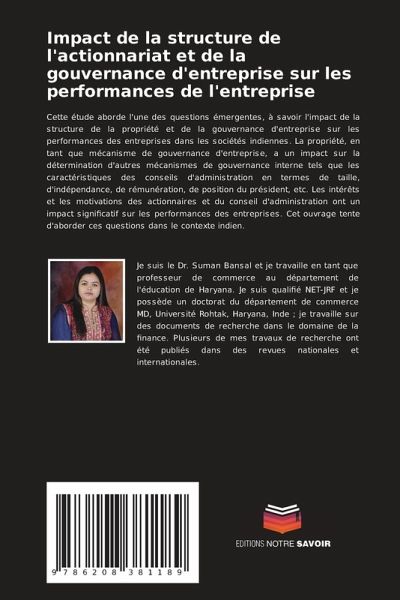 Cette étude aborde l'une des questions émergentes, à savoir l'impact de la structure de la propriété et de la gouvernance d'entreprise sur les performances des entreprises dans les sociétés indiennes. La propriété, en tant que mécanisme de gouvernance d'entreprise, a un impact sur la détermination d'autres mécanismes de gouvernance interne tels que les caractéristiques des conseils d'administration en termes de taille, d'indépendance, de rémunération, de position du président, etc. Les intérêts et les motivations des actionnaires et du conseil d'administration ont un impact significatif sur les performances des entreprises. Cet ouvrage tente d'aborder ces questions dans le contexte indien.