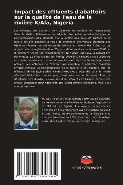 Les effluents des abattoirs sont déversés de manière non réglementée dans la rivière Katsina-Ala, au Nigeria. Les effets physicochimiques et bactériologiques des effluents sur la qualité des eaux de surface de la rivière ont été identifiés à l'aide de méthodes analytiques standard. Les résultats obtenus ont été comparés aux normes maximales fixées par les organismes de réglementation, l'Organisation mondiale de la santé (OMS) et le ministère fédéral de l'environnement du Nigeria. Bien que la plupart des paramètres se situent dans les limites stipulées, certains sont supérieurs aux limites maximales, ce qui fait que la rivière Katsina-Ala est légèrement polluée. Les effluents de l'abattoir ont contribué à perturber l'équilibre physico-chimique et bactériologique de la rivière. Il est suggéré que les effluents de l'abattoir soient traités avant d'être déversés dans la rivière afin de réduire les risques pour l'environnement et la santé. Pour un développement durable, les masses d'eau doivent être traitées comme des entités précieuses pour notre bien-être. L'eau semble abondante, mais c'est une denrée rare.
