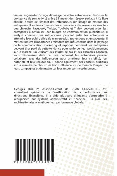 Voulez augmenter l'image de marge de votre entreprise et favoriser la croissance de son activité grâce à l'impact des réseaux sociaux ? Ce livre aborde le sujet de l'impact des influenceurs sur l'image de marque des entreprises. Il explore comment les influenceurs des réseaux sociaux tels que LinkedIn, Facebook, Twitter, YouTube et TikTok peuvent aider les entreprises à optimiser leur budget de communication publicitaire. Il analyse comment les influenceurs peuvent aider les entreprises à atteindre leur public cible de manière plus authentique et engageante. Il met en lumière l'importance croissante des influenceurs dans le paysage de la communication marketing et explique comment les entreprises peuvent tirer parti de cette tendance pour renforcer leur positionnement sur le marché. En utilisant des études de cas et des exemples concrets, vous découvrirez dans ce livre comment les entreprises peuvent collaborer avec des influenceurs pour améliorer leur visibilité, leur notoriété et leur réputation. Il donne également des conseils pratiques sur la manière de choisir les bons influenceurs, de mesurer l'impact de leurs campagnes et de maximiser leur retour sur investissement.