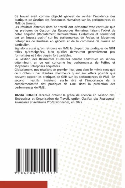 Ce travail avait comme objectif général de vérifier l'incidence des pratiques de Gestion des Ressources Humaines sur les performances de PME de Limete.Les résultats obtenus dans ce travail ont démontré avec certitude que les pratiques de Gestion des Ressources Humaines faisant l'objet de notre enquête (Recrutement, Rémunération, Evaluation et Formation) ont un impact positif sur les performances de Petites et Moyennes Entreprises de Kinshasa en général et de la commune de Limete en particulier.Signalons aussi qu'on retrouve en PME la plupart des pratiques de GRH telles qu'enseignées, bien qu'elles demeurent généralement peu formalisées et à des degrés fort variables.La Gestion des Ressources Humaines semble constituer un sérieux déterminant en ce qui concerne les performances de Petites et Moyennes Entreprises enquêtées.Globalement, nos résultats en premier lieu, vont dans le même sens que ceux obtenus par d'autres chercheurs quant aux effets positifs que peuvent exercer les pratiques de GRH sur les performances de PME. En second lieu, ils insistent sur le rôle et l'importance de la complémentarité des pratiques de GRH dans la prédiction des performances de PME.