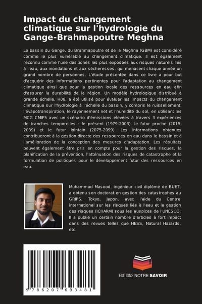 Le bassin du Gange, du Brahmapoutre et de la Meghna (GBM) est considéré comme le plus vulnérable au changement climatique. Il est également reconnu comme l'une des zones les plus exposées aux risques naturels liés à l'eau, aux inondations et aux sécheresses, qui menacent chaque année un grand nombre de personnes. L'étude présentée dans ce livre a pour but d'acquérir des informations pertinentes pour l'adaptation au changement climatique ainsi que pour la gestion locale des ressources en eau afin d'assurer la durabilité de la région. Un modèle hydrologique distribué à grande échelle, H08, a été utilisé pour évaluer les impacts du changement climatique sur l'hydrologie à l'échelle du bassin, y compris le ruissellement, l'évapotranspiration, le rayonnement net et l'humidité du sol, en utilisant les MCG CMIP5 avec un scénario d'émissions élevées à travers 3 expériences de tranches temporelles : le présent (1979-2003), le futur proche (2015-2039) et le futur lointain (2075-2099). Les informations obtenues contribueront à la gestion directe des ressources en eau dans le bassin et à l'amélioration de la conception des mesures d'adaptation. Les résultats peuvent également être pris en compte pour la gestion des risques, la planification de la prévention, l'atténuation des risques de catastrophe et la formulation de politiques pour le développement futur des ressources en eau.