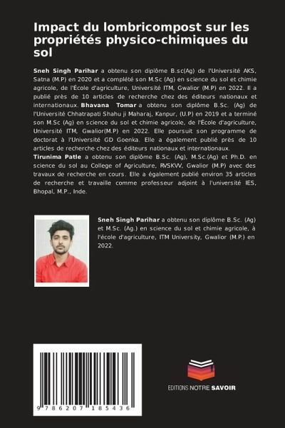 Sneh Singh Parihar a obtenu son diplôme B.sc(Ag) de l'Université AKS, Satna (M.P) en 2020 et a complété son M.Sc (Ag) en science du sol et chimie agricole, de l'École d'agriculture, Université ITM, Gwalior (M.P) en 2022. Il a publié près de 10 articles de recherche chez des éditeurs nationaux et internationaux. Bhavana Tomar a obtenu son diplôme B.Sc. (Ag) de l'Université Chhatrapati Shahu ji Maharaj, Kanpur, (U.P) en 2019 et a terminé son M.Sc (Ag) en science du sol et chimie agricole, de l'École d'agriculture, Université ITM, Gwalior(M.P) en 2022. Elle poursuit son programme de doctorat à l'Université GD Goenka. Elle a également publié près de 10 articles de recherche chez des éditeurs nationaux et internationaux.Tirunima Patle a obtenu son diplôme B.Sc. (Ag), M.Sc.(Ag) et Ph.D. en science du sol au College of Agriculture, RVSKVV, Gwalior (M.P) avec des travaux de recherche en cours. Elle a également publié environ 35 articles de recherche et travaille comme professeur adjoint à l'université IES, Bhopal, M.P., Inde.