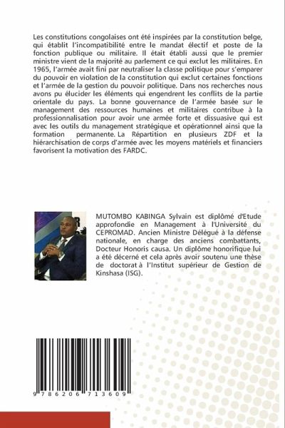 Les constitutions congolaises ont été inspirées par la constitution belge, qui établit l'incompatibilité entre le mandat électif et poste de la fonction publique ou militaire. Il était établi aussi que le premier ministre vient de la majorité au parlement ce qui exclut les militaires. En 1965, l'armée avait fini par neutraliser la classe politique pour s'emparer du pouvoir en violation de la constitution qui exclut certaines fonctions et l'armée de la gestion du pouvoir politique. Dans nos recherches nous avons pu élucider les éléments qui engendrent les conflits de la partie orientale du pays. La bonne gouvernance de l'armée basée sur le management des ressources humaines et militaires contribue à la professionnalisation pour avoir une armée forte et dissuasive qui est avec les outils du management stratégique et opérationnel ainsi que la formation permanente. La Répartition en plusieurs ZDF et la hiérarchisation de corps d'armée avec les moyens matériels et financiers favorisent la motivation des FARDC.