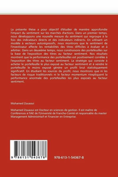 La présente thèse a pour objectif d'étudier de manière approfondie l'impact du sentiment sur les marchés d'actions. Dans un premier temps, nous développons une nouvelle mesure du sentiment qui regroupe à la fois des indicateurs directs et des indicateurs indirects. En utilisant un modèle à vecteurs autorégressifs, nous montrons que le sentiment de l'investisseur affecte les rentabilités des titres difficiles à évaluer et à arbitrer. Dans un deuxième temps, nous construisons des portefeuilles sur la base de l'exposition des titres au facteur sentiment. Nos résultats montrent que la performance des portefeuilles est positivement corrélée à l'exposition des titres au facteur sentiment. La stratégie qui consiste à acheter le portefeuille le plus exposé au facteur sentiment et à vendre le portefeuille le moins exposé génère un profit brut statistiquement significatif. En étudiant les sources du profit, nous montrons que ni les facteurs de risque traditionnels ni le facteur momentum n'expliquent la performance anormale des portefeuilles les plus exposés au facteur sentiment.