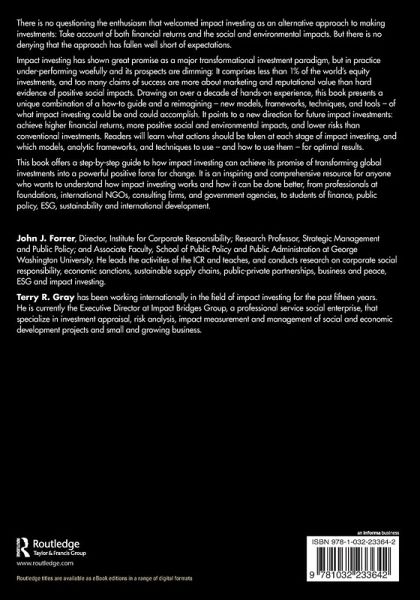 This book offers a step-by-step guide to how impact investing can achieve its promise of transforming global investments into a powerful positive force for change. It is an inspiring and comprehensive resource for anyone who wants to understand how impact investing works and how it can be done better, from professionals at foundations, international NGOs, consulting firms, and government agencies, to students of finance, public policy, ESG, sustainability and international development.