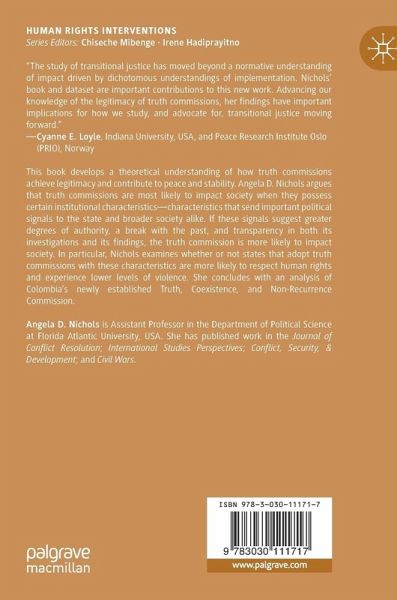 This book develops a theoretical understanding of how truth commissions achieve legitimacy and contribute to peace and stability. Angela D. Nichols argues that truth commissions are most likely to impact society when they possess certain institutional characteristics-characteristics that send important political signals to the state and broader society alike. If these signals suggest greater degrees of authority, a break with the past, and transparency in both its investigations and its findings, the truth commission is more likely to impact society. In particular, Nichols examines whether or not states that adopt truth commissions with these characteristics are more likely to respect human rights and experience lower levels of violence. She concludes with an analysis of Colombia's newly established Truth, Coexistence, and Non-Recurrence Commission.