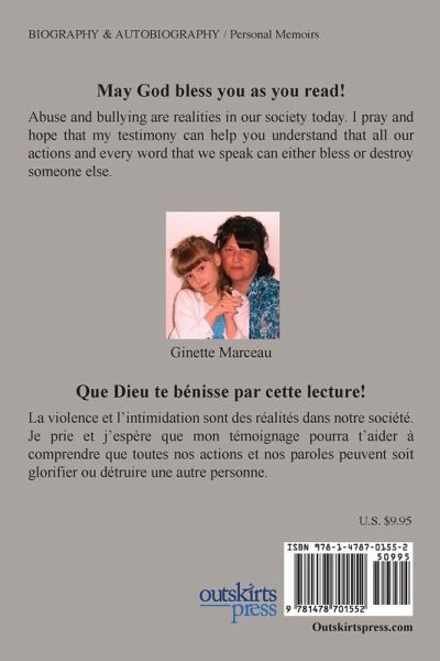 May God bless you as you read! Abuse and bullying are realities in our society today. I pray and hope that my testimony can help you understand that all our actions and every word that we speak can either bless or destroy someone else. Que Dieu te bénisse par cette lecture! La violence et l'intimidation sont des réalités dans notre société. Je prie et j'espère que mon témoignage pourra t'aider à comprendre que toutes nos actions et nos paroles peuvent soit glorifier ou détruire une autre personne.