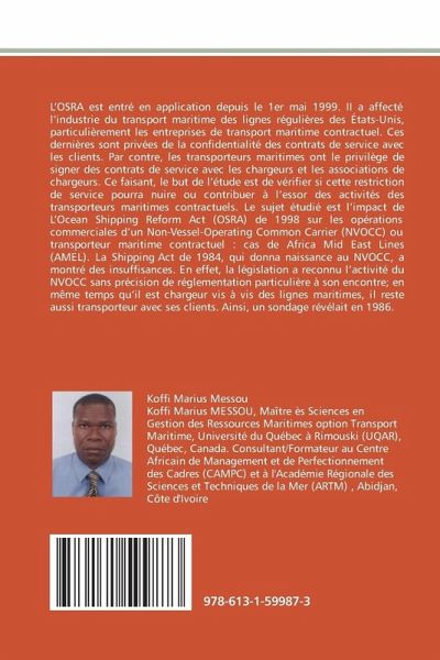 L'OSRA est entré en application depuis le 1er mai 1999. II a affecté l'industrie du transport maritime des lignes régulières des États-Unis, particulièrement les entreprises de transport maritime contractuel. Ces dernières sont privées de la confidentialité des contrats de service avec les clients. Par contre, les transporteurs maritimes ont le privilège de signer des contrats de service avec les chargeurs et les associations de chargeurs. Ce faisant, le but de l'étude est de vérifier si cette restriction de service pourra nuire ou contribuer à l'essor des activités des transporteurs maritimes contractuels. Le sujet étudié est l'impact de L'Ocean Shipping Reform Act (OSRA) de 1998 sur les opérations commerciales d'un Non-Vessel-Operating Common Carrier (NVOCC) ou transporteur maritime contractuel : cas de Africa Mid East Lines (AMEL). La Shipping Act de 1984, qui donna naissance au NVOCC, a montré des insuffisances. En effet, la législation a reconnu l'activité du NVOCC sans précision de réglementation particulière à son encontre; en même temps qu'il est chargeur vis à vis des lignes maritimes, il reste aussi transporteur avec ses clients. Ainsi, un sondage révélait en 1986.