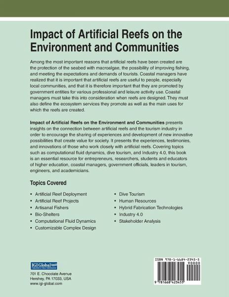Among the most important reasons that artificial reefs have been created are the protection of the seabed with macroalgae, the possibility of improving fishing, and meeting the expectations and demands of tourists. Coastal managers have realized that it is important that artificial reefs are useful to people, especially local communities, and that it is therefore important that they are promoted by government entities for various professional and leisure activity use. Coastal managers must take this into consideration when reefs are designed. They must also define the ecosystem services they promote as well as the main uses for which the reefs are created. Impact of Artificial Reefs on the Environment and Communities presents insights on the connection between artificial reefs and the tourism industry in order to encourage the sharing of experiences and development of new innovative possibilities that create value for society. It presents the experiences, testimonies, and innovations of those who work closely with artificial reefs. Covering topics such as computational fluid dynamics, dive tourism, and Industry 4.0, this book is an essential resource for entrepreneurs, researchers, students and educators of higher education, coastal managers, government officials, leaders in tourism, engineers, and academicians.
