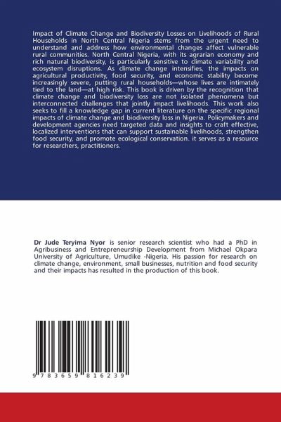 Impact of Climate Change and Biodiversity Losses on Livelihoods of Rural Households in North Central Nigeria stems from the urgent need to understand and address how environmental changes affect vulnerable rural communities. North Central Nigeria, with its agrarian economy and rich natural biodiversity, is particularly sensitive to climate variability and ecosystem disruptions. As climate change intensifies, the impacts on agricultural productivity, food security, and economic stability become increasingly severe, putting rural households-whose lives are intimately tied to the land-at high risk. This book is driven by the recognition that climate change and biodiversity loss are not isolated phenomena but interconnected challenges that jointly impact livelihoods. This work also seeks to fill a knowledge gap in current literature on the specific regional impacts of climate change and biodiversity loss in Nigeria. Policymakers and development agencies need targeted data and insights to craft effective, localized interventions that can support sustainable livelihoods, strengthen food security, and promote ecological conservation. it serves as a resource for researchers, practitioners.