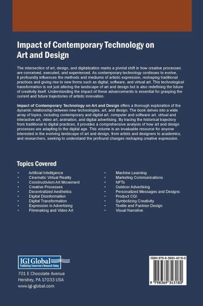 The intersection of art, design, and digitalization marks a pivotal shift in how creative processes are conceived, executed, and experienced. As contemporary technology continues to evolve, it profoundly influences the methods and mediums of artistic expression, reshaping traditional practices and giving rise to new forms such as digital, software, and virtual art. This technological transformation is not just altering the landscape of art and design but is also redefining the future of creativity itself. Understanding the impact of these advancements is essential for grasping the current and future trajectories of artistic innovation. Impact of Contemporary Technology on Art and Design offers a thorough exploration of the dynamic relationship between new technologies, art, and design. The book delves into a wide array of topics, including contemporary and digital art, computer and software art, virtual and interactive art, video art, animation, and digital advertising. By tracing the historical trajectory from traditional to digital practices, it provides a comprehensive analysis of how art and design processes are adapting to the digital age. This volume is an invaluable resource for anyone interested in the evolving landscape of art and design, from artists and designers to academics, and researchers, seeking to understand the profound changes reshaping creative expression.
