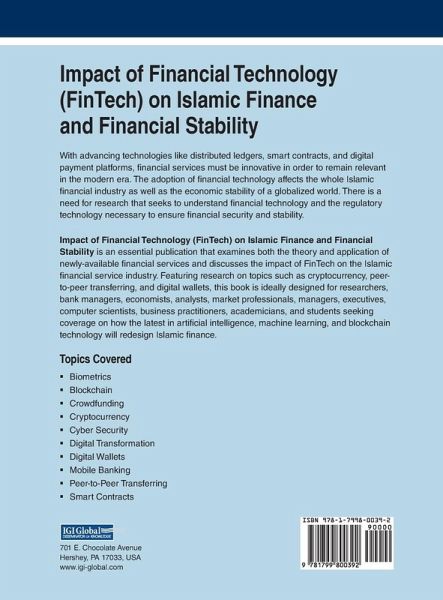 With advancing technologies like distributed ledgers, smart contracts, and digital payment platforms, financial services must be innovative in order to remain relevant in the modern era. The adoption of financial technology affects the whole Islamic financial industry as well as the economic stability of a globalized world. There is a need for research that seeks to understand financial technology and the regulatory technology necessary to ensure financial security and stability. Impact of Financial Technology (FinTech) on Islamic Finance and Financial Stability is an essential publication that examines both the theory and application of newly-available financial services and discusses the impact of FinTech on the Islamic financial service industry. Featuring research on topics such as cryptocurrency, peer-to-peer transferring, and digital wallets, this book is ideally designed for researchers, bank managers, economists, analysts, market professionals, managers, executives, computer scientists, business practitioners, academicians, and students seeking coverage on how the latest in artificial intelligence, machine learning, and blockchain technology will redesign Islamic finance.