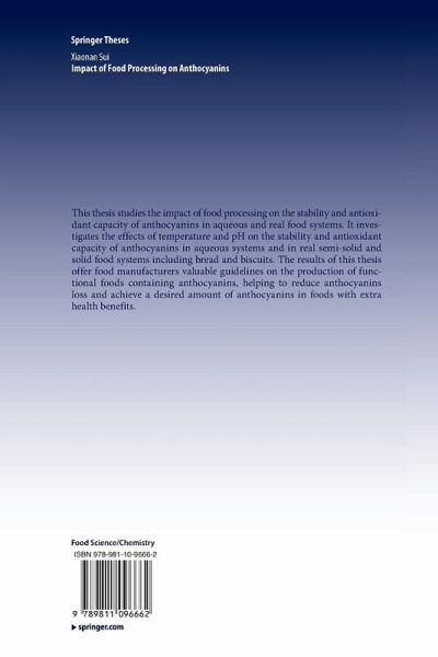 Introduction.- Literature Review.- Monte Carlo Modelling of Non-Isothermal Degradation of Two Cyanidin-Based Anthocyanins in Aqueous System at High Temperatures and its Impact on Antioxidant Capacities.- Combined Effect of pH and High Temperature on the Stability and Antioxidant Capacity of Two Anthocyanins in Aqueous Solution.- Changes in the Color, Chemical Stability and Antioxidant Capacity of Thermally Treated Anthocyanin Aqueous Solution Over Storage.- Anthocyanins During Baking: their Degradation Kinetics and Impacts on Color and Antioxidant Capacity of Bread.- Bread Fortified with Anthocyanin-rich Extract from Black Rice as Nutraceutical Sources: its Quality Attributes and In Vitro Digestibility.- Anthocyanins as Functional Ingredients in Biscuits: Their Stability, Antioxidant Capacity, and Preventive Effect on Retarding Lipid Oxidation.- In Vitro and In Silico Studies of Anthocyanins Against Pancreatic A-Amylase.- Conclusions and Recommendations.