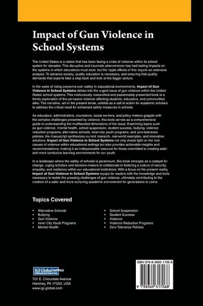 The United States is a nation that has been facing a crisis of violence within its school system for decades. This disruptive and traumatic phenomenon has had lasting impacts on the systems in which educations must exist, but the ripple effects of this require an extensive analysis. To advance society, quality education is necessary, and ensuring that quality demands that experts take a step back and look at the bigger picture. In the wake of rising concerns over safety in educational environments, Impact of Gun Violence in School Systems delves into the urgent issue of gun violence within the United States' school systems. As educators, administrators, counselors, social workers, and policy makers grapple with the complex challenges presented by violence, this book serves as a comprehensive guide to understanding the multifaceted dimensions of the issue. Examining topics such as gun violence, mental health, school suspension, student success, bullying, violence reduction programs, alternative schools, inner-city youth programs, and zero-tolerance policies, the manuscript synthesizes current research, real-world examples, and innovative solutions. Impact of Gun Violence in School Systems not only sheds light on the root causes of violence within educational settings but also provides actionable insights and recommendations, making it an indispensable resource for those committed to creating safer and more conducive learning environments for our youth.