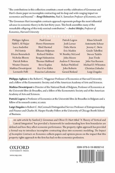 The 1986 article by Sanford J. Grossman and Oliver D. Hart titled "A Theory of Vertical and Lateral Integration" has provided a framework for understanding how firm boundaries are defined and how they affect economic performance. The property rights approach has provided a formal way to introduce incomplete contracting ideas into economic modeling. The Impact of Incomplete Contracts on Economics collects papers and opinion pieces on the impact that this property right approach to the firm has had on the economics profession.