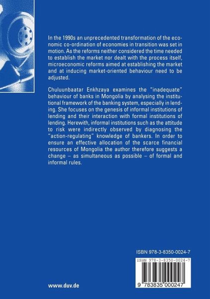 The surprisingly slow process of economic transformation is a well-known but not well-understood phenomenon in economies in transition (EIT). Neither mac- economic arguing nor neoclassic micro approaches turned out to provide helpful tools in explaining the barriers to transform markets and institutions. Chuluunbaatar Enkhzaya addresses the issue of economic transformation, exemplarily by looking at the Mongolian loan market. Her methodological innovation is not only to employ the New Institutional Economy but also to operationalise the degree of institutional change. This is done by using concept mapping, besides the more standard way of interviewing. It allows to identify "action regulating knowledge" governing the decision behavior of credit officers and leading to an indirect observation of informal rules like attitude to risk, perception of supervision, social and ethic commitments. Enkhzaya adds to our understanding why the enforcement of banking regulation norms has not led to an efficient allocation of resources in EIT banking systems. Besides she gives an impressive description of the actual state of the Mongolian economy.