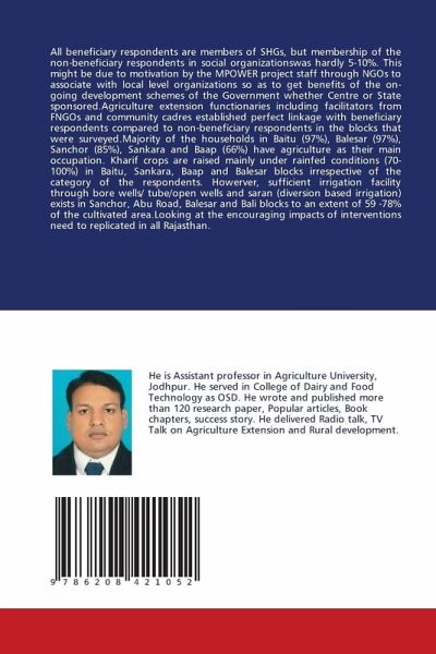 All beneficiary respondents are members of SHGs, but membership of the non-beneficiary respondents in social organizationswas hardly 5-10%. This might be due to motivation by the MPOWER project staff through NGOs to associate with local level organizations so as to get benefits of the on-going development schemes of the Government whether Centre or State sponsored.Agriculture extension functionaries including facilitators from FNGOs and community cadres established perfect linkage with beneficiary respondents compared to non-beneficiary respondents in the blocks that were surveyed.Majority of the households in Baitu (97%), Balesar (97%), Sanchor (85%), Sankara and Baap (66%) have agriculture as their main occupation. Kharif crops are raised mainly under rainfed conditions (70-100%) in Baitu, Sankara, Baap and Balesar blocks irrespective of the category of the respondents. Howerver, sufficient irrigation facility through bore wells/ tube/open wells and saran (diversion based irrigation) exists in Sanchor, Abu Road, Balesar and Bali blocks to an extent of 59 -78% of the cultivated area.Looking at the encouraging impacts of interventions need to replicated in all Rajasthan.