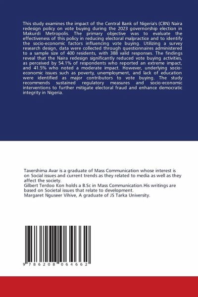 This study examines the impact of the Central Bank of Nigeria's (CBN) Naira redesign policy on vote buying during the 2023 governorship election in Makurdi Metropolis. The primary objective was to evaluate the effectiveness of this policy in reducing electoral malpractice and to identify the socio-economic factors influencing vote buying. Utilizing a survey research design, data were collected through questionnaires administered to a sample size of 400 residents, with 388 valid responses. The findings reveal that the Naira redesign significantly reduced vote buying activities, as perceived by 54.1% of respondents who reported an extreme impact, and 41.5% who noted a moderate impact. However, underlying socio-economic issues such as poverty, unemployment, and lack of education were identified as major contributors to vote buying. The study recommends sustained regulatory measures and socio-economic interventions to further mitigate electoral fraud and enhance democratic integrity in Nigeria.