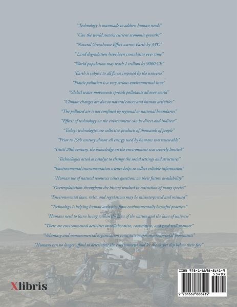 " Technology is manmade to address human needs" "Can the world sustain current economic growth?" "Natural Greenhouse Effect warms Earth by 33C" " Land degradation have been cumulative over time" "World population may reach 1 trillion by 9000 CE" "Earth is subject to all forces imposed by the universe" "Plastic pollution is a very serious environmental issue" "Global water movements spreads pollutants all over world" "Climate changes are due to natural causes and human activities" "The polluted air is not confined by regional or national boundaries" "Effects of technology on the environment can be direct and indirect" "Today's technologies are collective products of thousands of people" "Prior to 19th century almost all energy used by humans was renewable" "Until 20th century, the knowledge on the environment was severely limited" "Technologies acted as catalyst to change the social settings and structures" "Environmental instrumentation science helps to collect reliable information" "Human use of natural resources raises questions on their future availability" "Overexploitation throughout the history resulted in extinction of many species" "Environmental laws, rules, and regulations may be misinterpreted and misused" "Technology is helping human activities from environmentally harmful practices" "Humans need to learn living within the laws of the nature and the laws of universe" "There are environmental activities in collaborative, cooperative, and good will manner" "Voluntary and noncommercial organization constitute major environmental movements" "Humans can no longer afford to deteriorate the environment and let the carpet slip below their feet"