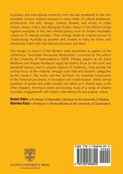 Australian and international modernity from the late 19th to the mid-20th century inspires research in many fields of cultural endeavour: architecture, fine arts, design, cinema, theatre, and music; in urban studies, literary history and Aboriginal studies. Impact of the Modern brings together examples of this new interdisciplinary work on modern Australian culture by 21 leading scholars. Their writings reveal an original account of 'modernising' Australia as dynamic and creative in many art forms, and interactively linked with international processes and ideas. The essays in Impact of the Modern were presented as papers at the conference, 'Australian Vernacular Modernities', convened by the editors at the University of Queensland in 2006. Plenary papers by Jill Julius Matthews and Angela Woollacott signal the book's focus on the erotic and gendered spaces, and on popular aspects of modernity. They provide the central focus of the material, through such vital and dynamic categories as the 'modern', the 'erotic' and the 'primitive'. As essential components of the historical processes of innovation and modernisation, these central questions of gender and public sociality are taken up in diverse ways in the other chapters, forming a varied and exciting study of a range of creative Australian engagements with modern international life and popular culture.