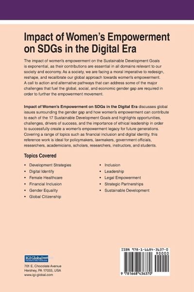 The impact of women's empowerment on the Sustainable Development Goals is exponential, as their contributions are essential in all domains relevant to our society and economy. As a society, we are facing a moral imperative to redesign, reshape, and recalibrate our global approach towards women's empowerment. A call to action and alternative pathways that can address some of the major challenges that fuel the global, social, and economic gender gap are required in order to further the empowerment movement. Impact of Women's Empowerment on SDGs in the Digital Era discusses global issues surrounding the gender gap and how women's empowerment can contribute to each of the 17 Sustainable Development Goals and highlights opportunities, challenges, drivers of success, and the importance of ethical leadership in order to successfully create a women's empowerment legacy for future generations. Covering a range of topics such as financial inclusion and digital identity, this reference work is ideal for policymakers, lawmakers, government officials, researchers, academicians, scholars, researchers, instructors, and students.