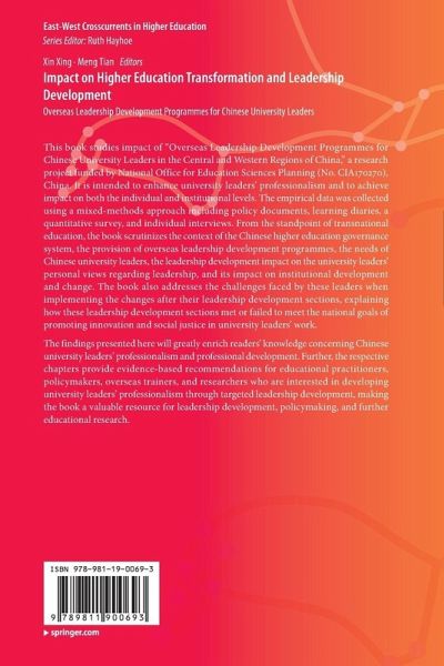 This book studies impact of "Overseas Leadership Development Programmes for Chinese University Leaders in the Central and Western Regions of China," a research project funded by National Office for Education Sciences Planning (No. CIA170270), China. It is intended to enhance university leaders' professionalism and to achieve impact on both the individual and institutional levels. The empirical data was collected using a mixed-methods approach including policy documents, learning diaries, a quantitative survey, and individual interviews. From the standpoint of transnational education, the book scrutinizes the context of the Chinese higher education governance system, the provision of overseas leadership development programmes, the needs of Chinese university leaders, the leadership development impact on the university leaders' personal views regarding leadership, and its impact on institutional development and change. The book also addresses the challenges faced by these leaders when implementing the changes after their leadership development sections, explaining how these leadership development sections met or failed to meet the national goals of promoting innovation and social justice in university leaders' work. The findings presented here will greatly enrich readers' knowledge concerning Chinese university leaders' professionalism and professional development. Further, the respective chapters provide evidence-based recommendations for educational practitioners, policymakers, overseas trainers, and researchers who are interested in developing university leaders' professionalism through targeted leadership development, making the book a valuable resource for leadership development, policymaking, and further educational research.