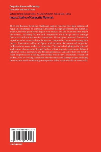 This book discusses the impact of different range of velocities (low, high, ballistic and hyper-velocity impact) on composites. Presented through experimental and numerical analysis, the book goes beyond impact event analysis and also covers the after-impact phenomena, including flexural and compression and damage analysis through destructive and non-destructive evaluations. The analyses presented from either experimental or numerical simulations are composed of micro and macrographs images, illustrations, tables and figures with inclusive discussions and supportive evidences from recent studies on composites. This book also highlights the potential applications of composites through the lens of their impact properties, in different industries such as automotive and defence applications. Generally, this book benefits wider range of readers including the industrial practitioners, researchers, lecturer and students, who are working in the fields related to impact and damage analysis, including the structural health monitoring of composites, either experimentally or numerically.