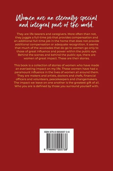 Women are an eternally special and integral part of the world. They are lifebearers and caregivers. More often than not, they juggle a full-time job that provides compensation and an additional full-time job in the home that does not provide additional compensation or adequate recognition. It seems that much of the accolades that do go to women go only to those of great influence and power within the public eye. Behind the scenes and behind the public eye, there are women of great impact. These are their stories. This book is a collection of stories of women who have made an everlasting impact on my life. These women have had a paramount influence in the lives of women all around them. They are makers and artists, doctors and chefs, financial officers and volunteers, peacekeepers and changemakers. The impact we leave on one another is the greatest gift of all. Who you are is defined by those you surround yourself with.