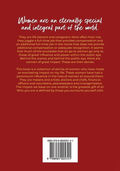 Women are an eternally special and integral part of the world. They are lifebearers and caregivers. More often than not, they juggle a full-time job that provides compensation and an additional full-time job in the home that does not provide additional compensation or adequate recognition. It seems that much of the accolades that do go to women go only to those of great influence and power within the public eye. Behind the scenes and behind the public eye, there are women of great impact. These are their stories. This book is a collection of stories of women who have made an everlasting impact on my life. These women have had a paramount influence in the lives of women all around them. They are makers and artists, doctors and chefs, financial officers and volunteers, peacekeepers and changemakers. The impact we leave on one another is the greatest gift of all. Who you are is defined by those you surround yourself with.