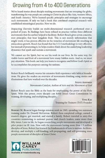 Growing from 4 to 400 Generations We’ve heard stories about disciple-making movements that are sweeping the globe, transforming the way people are coming to Christ in places like Asia, western Africa, and South America. We’ve learned specific principles and strategies to encourage such movements. If only we had a book that combined empirical research with established missiological practice. Now we do. Impacting Eternity builds on multi-dimensional research performed over a period of years. Its findings have been refined in practice within three different movements that the author helped to facilitate. Robert Reach gives seven concrete, root principles that bear kingdom fruit. This is not merely information that might work; it has proven effective in the trenches of movement life resulting in miraculous growth. Reach has found that his 5-5-5 methodology is very effective, but instead of promoting it, he helps readers think about the underlying leadership dynamics that spark and sustain a movement. We cannot see the Spirit, but we see his work in our lives. In the same way, the visible leaves and fruit of a movement have many hidden roots. And so, we must pay attention. This book can help you learn to recognize and follow God’s Spirit as he accomplishes his purposes among the nations.