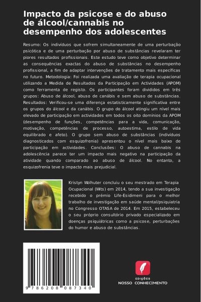 Resumo: Os indivíduos que sofrem simultaneamente de uma perturbação psicótica e de uma perturbação por abuso de substâncias revelaram ter piores resultados profissionais. Este estudo teve como objetivo determinar as consequências exactas do abuso de substâncias no desempenho profissional, a fim de adaptar intervenções de tratamento mais específicas no futuro. Metodologia: Foi realizada uma avaliação de terapia ocupacional utilizando a Medida de Resultados da Participação em Actividades (APOM) como ferramenta de registo. Os participantes foram divididos em três grupos: Abuso de álcool, abuso de canábis e sem abuso de substâncias. Resultados: Verificou-se uma diferença estatisticamente significativa entre os grupos do álcool e da canábis. O grupo do álcool atingiu um nível mais elevado de participação em actividades em todos os oito domínios da APOM (desempenho de funções, competências para a vida, comunicação, motivação, competências de processo, autoestima, estilo de vida equilibrado e afeto). O grupo sem abuso de substâncias (indivíduos diagnosticados com esquizofrenia) apresentou o nível mais baixo de participação em actividades. Conclusões: O abuso de cannabis na adolescência parece ter um impacto mais negativo na participação da atividade quando comparado ao abuso de álcool. No entanto, a esquizofrenia teve o impacto mais prejudicial.