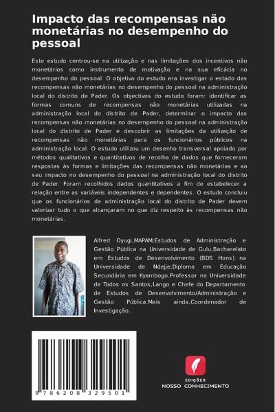 Este estudo centrou-se na utilização e nas limitações dos incentivos não monetários como instrumento de motivação e na sua eficácia no desempenho do pessoal. O objetivo do estudo era investigar o estado das recompensas não monetárias no desempenho do pessoal na administração local do distrito de Pader. Os objectivos do estudo foram: identificar as formas comuns de recompensas não monetárias utilizadas na administração local do distrito de Pader, determinar o impacto das recompensas não monetárias no desempenho do pessoal na administração local do distrito de Pader e descobrir as limitações da utilização de recompensas não monetárias para os funcionários públicos na administração local. O estudo utilizou um desenho transversal apoiado por métodos qualitativos e quantitativos de recolha de dados que forneceram respostas às formas e limitações das recompensas não monetárias e ao seu impacto no desempenho do pessoal na administração local do distrito de Pader. Foram recolhidos dados quantitativos a fim de estabelecer a relação entre as variáveis independentes e dependentes. O estudo concluiu que os funcionários da administração local do distrito de Pader devem valorizar tudo o que alcançaram no que diz respeito às recompensas não monetárias.