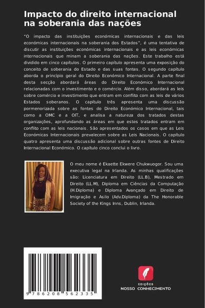 "O impacto das instituições económicas internacionais e das leis económicas internacionais na soberania dos Estados", é uma tentativa de discutir as instituições económicas internacionais e as leis económicas internacionais que minam a soberania das nações. Este trabalho está dividido em cinco capítulos. O primeiro capítulo apresenta uma exposição do conceito de soberania do Estado e das suas fontes. O segundo capítulo aborda o princípio geral do Direito Económico Internacional. A parte final desta secção abordará áreas do Direito Económico Internacional relacionadas com o investimento e o comércio. Além disso, abordará as leis sobre comércio e investimento que entram em conflito com as leis de vários Estados soberanos. O capítulo três apresenta uma discussão pormenorizada sobre as fontes do Direito Económico Internacional, tais como a OMC e a OIT, e analisa a natureza dos tratados destas organizações, aprofundando as áreas em que estes tratados entram em conflito com as leis nacionais. São apresentados os casos em que as Leis Económicas Internacionais prevalecem sobre as Leis Nacionais. O capítulo quatro apresenta uma discussão adicional sobre outras fontes de Direito Internacional Económico. O capítulo cinco conclui o livro.
