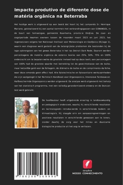Het huidige werk is uitgevoerd op een beeld dat hoort bij het camponês Sr. Henrique Mariano, gelokaliseerd bij een aantal bommen met verbrandingsgassen van SONANGOL, in de buurt van homaengue, gemeente Kuanhama, provincie Ondjiva. De zaai- en oogstperiode kwamen overeen tussen de maanden maart 2023 en juni 2023, het regenseizoen volgens het Nationaal Instituut voor Meteorologie en Geofysica (Bijlage 1), waarin een diagnose werd gesteld van de belangrijkste problemen die bestonden bij de lage opbrengsten van het gewas Beterraba in het ras Detroit Dark Rede. Daarom werden percentagens de matéria orgânica de esterco bovino van 25%, 50%, 75% en 100% onderzocht om te bepalen welke de grootste invloed had op deze teelt; een percentagem van 100% had de grootste waarde met betrekking tot de gewichtsklasse van de bulbo, maar hetzelfde gold voor de folhagem, de diâmetro do bulbo en de comprimento da folha, waar deze emenda geen effect had. Alle fytotechnische en fytosanitaire werkzaamheden die zijn vastgelegd in het Technisch Handboek voor Organoponics, Intensieve Tuinbouw en Halfbeschermde Organoponics werden uitgevoerd. De analyse werd uitgevoerd met behulp van het statistisch programma, met een volledig gerandomiseerd ontwerp en de Duncan-test werd gebruikt.