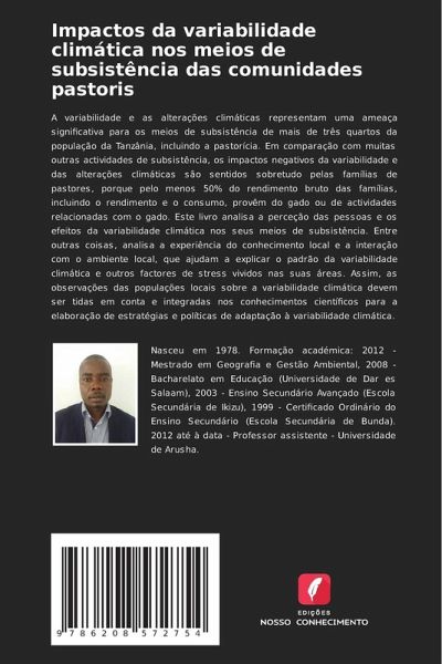 A variabilidade e as alterações climáticas representam uma ameaça significativa para os meios de subsistência de mais de três quartos da população da Tanzânia, incluindo a pastorícia. Em comparação com muitas outras actividades de subsistência, os impactos negativos da variabilidade e das alterações climáticas são sentidos sobretudo pelas famílias de pastores, porque pelo menos 50% do rendimento bruto das famílias, incluindo o rendimento e o consumo, provêm do gado ou de actividades relacionadas com o gado. Este livro analisa a perceção das pessoas e os efeitos da variabilidade climática nos seus meios de subsistência. Entre outras coisas, analisa a experiência do conhecimento local e a interação com o ambiente local, que ajudam a explicar o padrão da variabilidade climática e outros factores de stress vividos nas suas áreas. Assim, as observações das populações locais sobre a variabilidade climática devem ser tidas em conta e integradas nos conhecimentos científicos para a elaboração de estratégias e políticas de adaptação à variabilidade climática.
