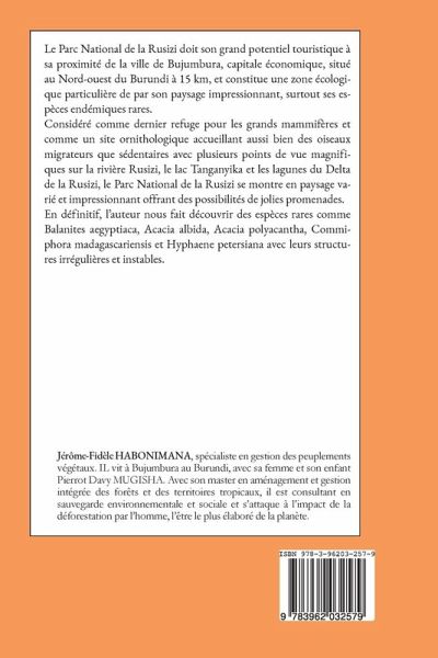Le Parc National de la Rusizi doit son grand potentiel touristique à sa proximité de la ville de Bujumbura, capitale économique, situé au Nord-ouest du Burundi à 15 km, et constitue une zone écologique particulière de par son paysage impressionnant, surtout ses espèces endémiques rares.Considéré comme dernier refuge pour les grands mammifères et comme un site ornithologique accueillant aussi bien des oiseaux migrateurs que sédentaires avec plusieurs points de vue magnifiques sur la rivière Rusizi, le lac Tanganyika et les lagunes du Delta de la Rusizi, le Parc National de la Rusizi se montre en paysage varié et impressionnant offrant des possibilités de jolies promenades.En définitif, l'auteur nous fait découvrir des espèces rares comme Balanites aegyptiaca, Acacia albida, Acacia polyacantha, Commiphora madagascariensis et Hyphaene petersiana avec leurs structures irrégulières et instables.