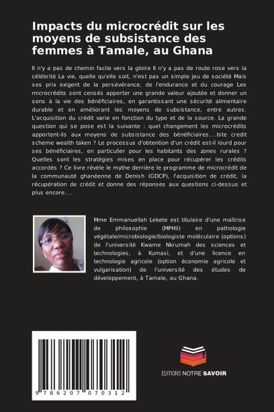 Il n'y a pas de chemin facile vers la gloire Il n'y a pas de route rose vers la célébrité La vie, quelle qu'elle soit, n'est pas un simple jeu de société Mais ses prix exigent de la persévérance, de l'endurance et du courage Les microcrédits sont censés apporter une grande valeur ajoutée et donner un sens à la vie des bénéficiaires, en garantissant une sécurité alimentaire durable et en améliorant les moyens de subsistance, entre autres. L'acquisition du crédit varie en fonction du type et de la source. La grande question qui se pose est la suivante : quel changement les microcrédits apportent-ils aux moyens de subsistance des bénéficiaires....Iste credit scheme wealth taken ? Le processus d'obtention d'un crédit est-il lourd pour ses bénéficiaires, en particulier pour les habitants des zones rurales ? Quelles sont les stratégies mises en place pour récupérer les crédits accordés ? Ce livre révèle le mythe derrière le programme de microcrédit de la communauté ghanéenne de Denish (GDCP), l'acquisition de crédit, la récupération de crédit et donne des réponses aux questions ci-dessus et plus encore....