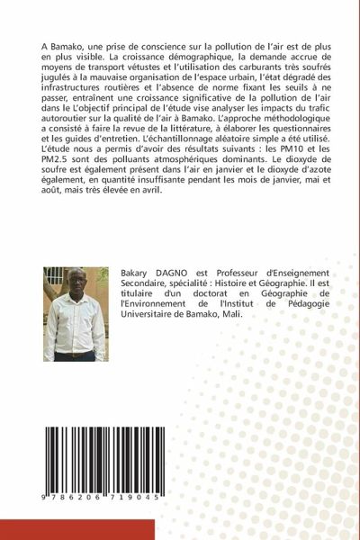 A Bamako, une prise de conscience sur la pollution de l'air est de plus en plus visible. La croissance démographique, la demande accrue de moyens de transport vétustes et l'utilisation des carburants très soufrés jugulés à la mauvaise organisation de l'espace urbain, l'état dégradé des infrastructures routières et l'absence de norme fixant les seuils à ne passer, entraînent une croissance significative de la pollution de l'air dans le L'objectif principal de l'étude vise analyser les impacts du trafic autoroutier sur la qualité de l'air à Bamako. L'approche méthodologique a consisté à faire la revue de la littérature, à élaborer les questionnaires et les guides d'entretien. L'échantillonnage aléatoire simple a été utilisé. L'étude nous a permis d'avoir des résultats suivants : les PM10 et les PM2.5 sont des polluants atmosphériques dominants. Le dioxyde de soufre est également présent dans l'air en janvier et le dioxyde d'azote également, en quantité insuffisante pendant les mois de janvier, mai et août, mais très élevée en avril.