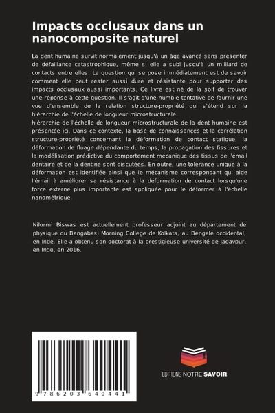 La dent humaine survit normalement jusqu'à un âge avancé sans présenter de défaillance catastrophique, même si elle a subi jusqu'à un milliard de contacts entre elles. La question qui se pose immédiatement est de savoir comment elle peut rester aussi dure et résistante pour supporter des impacts occlusaux aussi importants. Ce livre est né de la soif de trouver une réponse à cette question. Il s'agit d'une humble tentative de fournir une vue d'ensemble de la relation structure-propriété qui s'étend sur la hiérarchie de l'échelle de longueur microstructurale.hiérarchie de l'échelle de longueur microstructurale de la dent humaine est présentée ici. Dans ce contexte, la base de connaissances et la corrélation structure-propriété concernant la déformation de contact statique, la déformation de fluage dépendante du temps, la propagation des fissures et la modélisation prédictive du comportement mécanique des tissus de l'émail dentaire et de la dentine sont discutées. En outre, une tolérance unique à la déformation est identifiée ainsi que le mécanisme correspondant qui aide l'émail à améliorer sa résistance à la déformation de contact lorsqu'une force externe plus importante est appliquée pour le déformer à l'échelle nanométrique.
