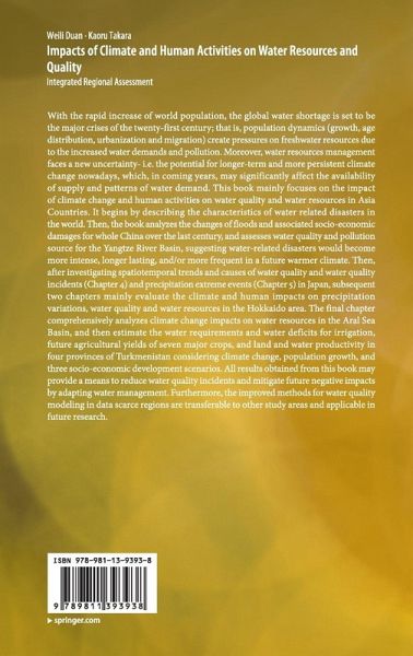 With the rapid increase of world population, the global water shortage is set to be the major crises of the twenty-first century; that is, population dynamics (growth, age distribution, urbanization and migration) create pressures on freshwater resources due to the increased water demands and pollution. Moreover, water resources management faces a new uncertainty- i.e. the potential for longer-term and more persistent climate change nowadays, which, in coming years, may significantly affect the availability of supply and patterns of water demand. This book mainly focuses on the impact of climate change and human activities on water quality and water resources in Asia Countries. It begins by describing the characteristics of water related disasters in the world. Then, the book analyzes the changes of floods and associated socio-economic damages for whole China over the last century, and assesses water quality and pollution source for the Yangtze River Basin, suggestingwater-related disasters would become more intense, longer lasting, and/or more frequent in a future warmer climate. Then, after investigating spatiotemporal trends and causes of water quality and water quality incidents (Chapter 4) and precipitation extreme events (Chapter 5) in Japan, subsequent two chapters mainly evaluate the climate and human impacts on precipitation variations, water quality and water resources in the Hokkaido area. The final chapter comprehensively analyzes climate change impacts on water resources in the Aral Sea Basin, and then estimate the water requirements and water deficits for irrigation, future agricultural yields of seven major crops, and land and water productivity in four provinces of Turkmenistan considering climate change, population growth, and three socio-economic development scenarios. All results obtained from this book may provide a means to reduce water quality incidents and mitigate future negative impacts by adapting water management. Furthermore, the improved methods for water quality modeling in data scarce regions are transferable to other study areas and applicable in future research.
