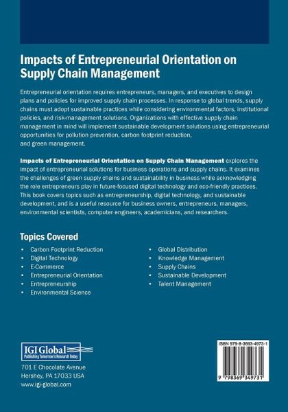 Entrepreneurial orientation requires entrepreneurs, managers, and executives to design plans and policies for improved supply chain processes. In response to global trends, supply chains must adopt sustainable practices while considering environmental factors, institutional policies, and risk-management solutions. Organizations with effective supply chain management in mind will implement sustainable development solutions using entrepreneurial opportunities for pollution prevention, carbon footprint reduction, and green management. Impacts of Entrepreneurial Orientation on Supply Chain Management explores the impact of entrepreneurial solutions for business operations and supply chains. It examines the challenges of green supply chains and sustainability in business while acknowledging the role entrepreneurs play in future-focused digital technology and eco-friendly practices. This book covers topics such as entrepreneurship, digital technology, and sustainable development, and is a useful resource for business owners, entrepreneurs, managers, environmental scientists, computer engineers, academicians, and researchers.