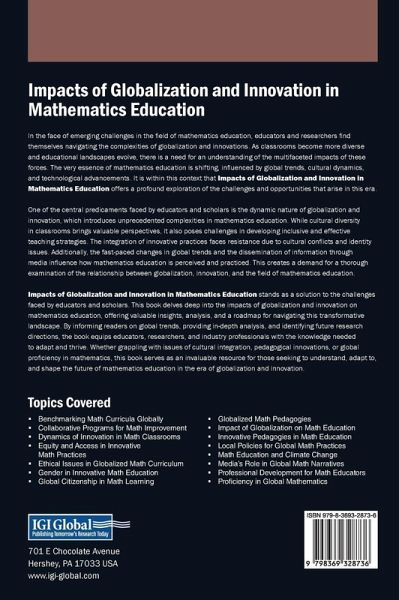 In the face of emerging challenges in the field of mathematics education, educators and researchers find themselves navigating the complexities of globalization and innovations. As classrooms become more diverse and educational landscapes evolve, there is a need for an understanding of the multifaceted impacts of these forces. The very essence of mathematics education is shifting, influenced by global trends, cultural dynamics, and technological advancements. It is within this context that Impacts of Globalization and Innovation in Mathematics Education offers a profound exploration of the challenges and opportunities that arise in this era. One of the central predicaments faced by educators and scholars is the dynamic nature of globalization and innovation, which introduces unprecedented complexities in mathematics education. While cultural diversity in classrooms brings valuable perspectives, it also poses challenges in developing inclusive and effective teaching strategies. The integration of innovative practices faces resistance due to cultural conflicts and identity issues. Additionally, the fast-paced changes in global trends and the dissemination of information through media influence how mathematics education is perceived and practiced. This creates a demand for a thorough examination of the relationship between globalization, innovation, and the field of mathematics education.