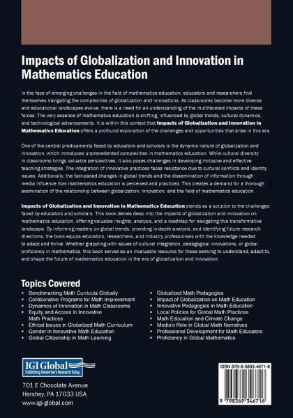 In the face of emerging challenges in the field of mathematics education, educators and researchers find themselves navigating the complexities of globalization and innovations. As classrooms become more diverse and educational landscapes evolve, there is a need for an understanding of the multifaceted impacts of these forces. The very essence of mathematics education is shifting, influenced by global trends, cultural dynamics, and technological advancements. It is within this context that Impacts of Globalization and Innovation in Mathematics Education offers a profound exploration of the challenges and opportunities that arise in this era. One of the central predicaments faced by educators and scholars is the dynamic nature of globalization and innovation, which introduces unprecedented complexities in mathematics education. While cultural diversity in classrooms brings valuable perspectives, it also poses challenges in developing inclusive and effective teaching strategies. The integration of innovative practices faces resistance due to cultural conflicts and identity issues. Additionally, the fast-paced changes in global trends and the dissemination of information through media influence how mathematics education is perceived and practiced. This creates a demand for a thorough examination of the relationship between globalization, innovation, and the field of mathematics education.